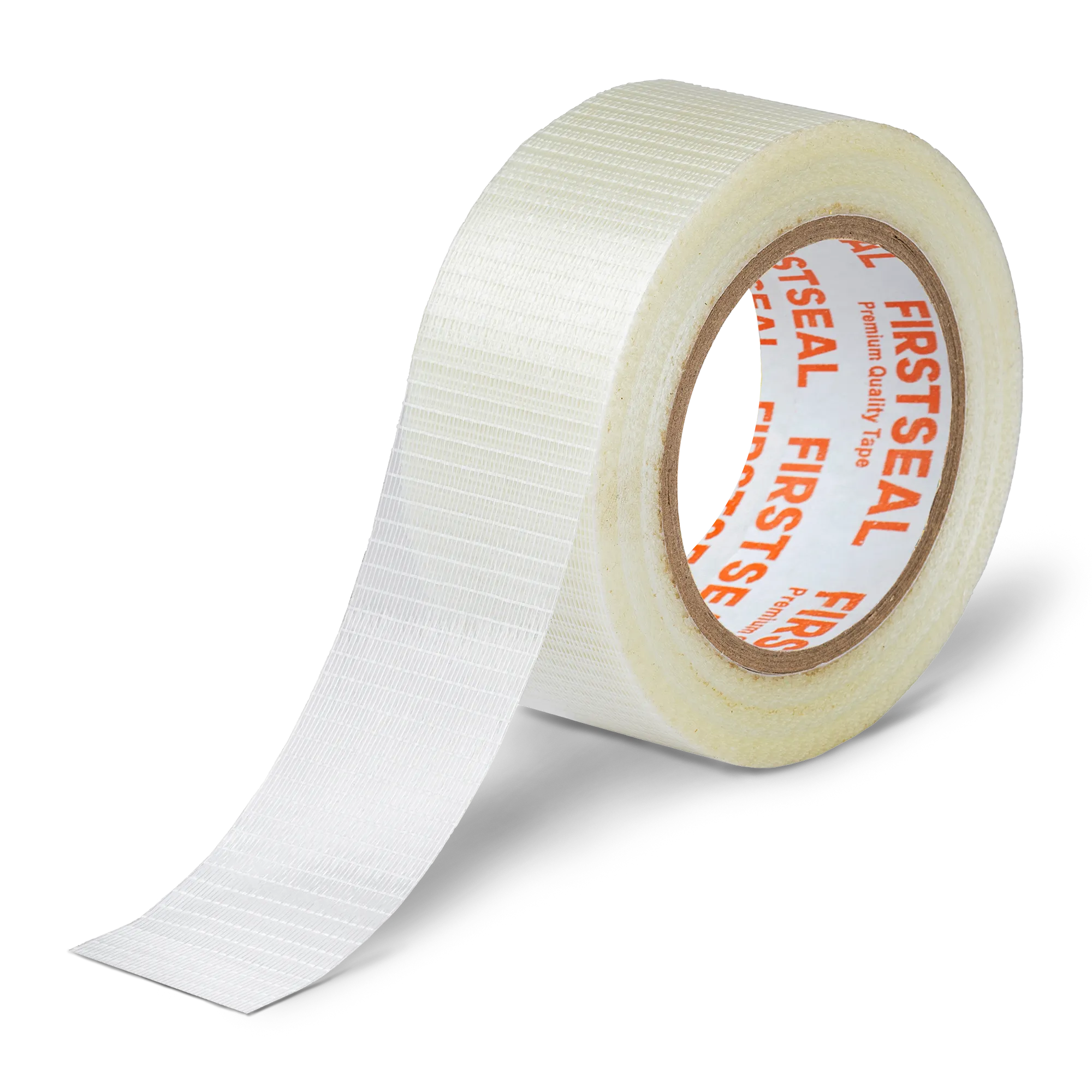 Reinforced tape with fiberglass filaments for heavy-duty packaging, bundling, and securing loads.